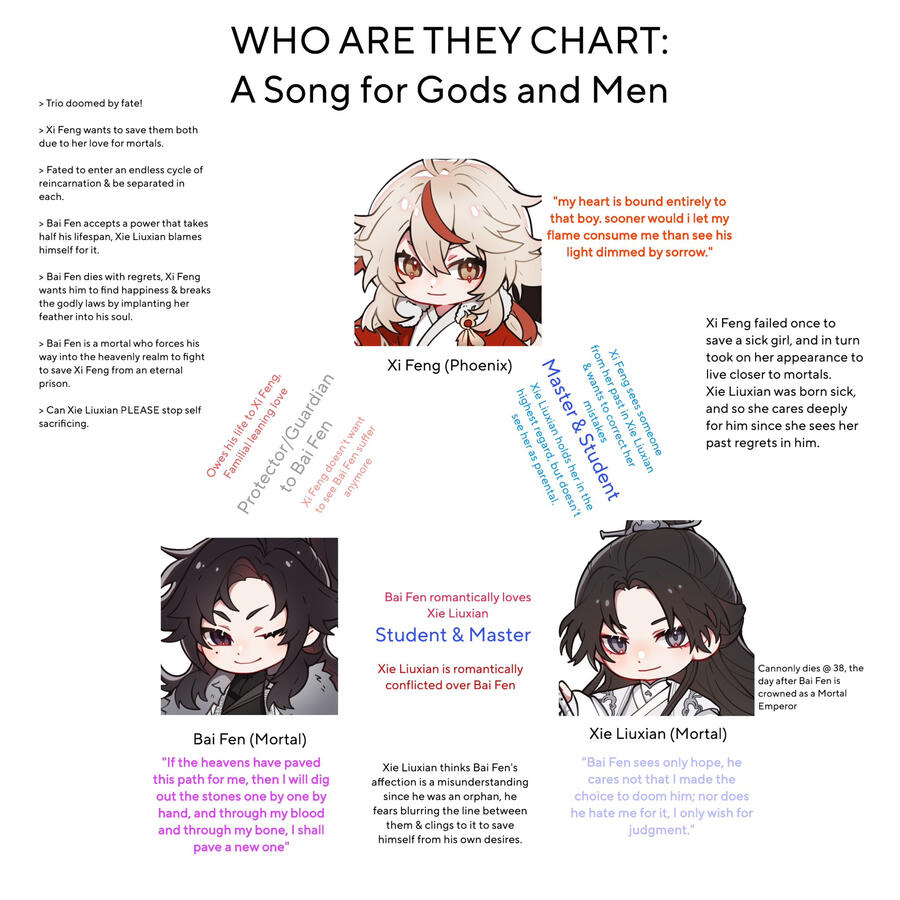 A Song of Gods and Men has several story arcs;ARC 1 - Follows the lives of Bai Fen, Xie Liuxian, and Xi Feng in their time alive as Bai Fen grows into his power and walks the path to become the Mortal Emperor.